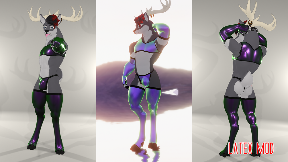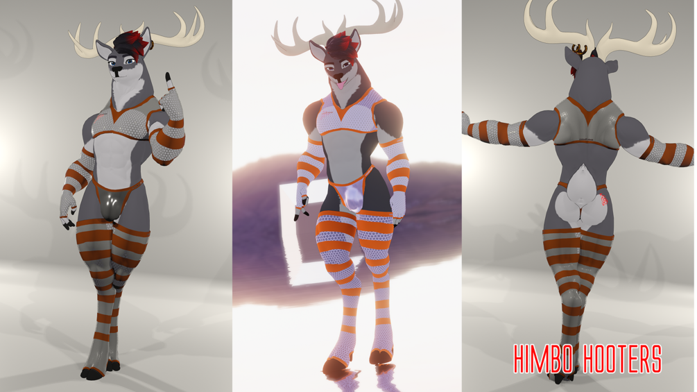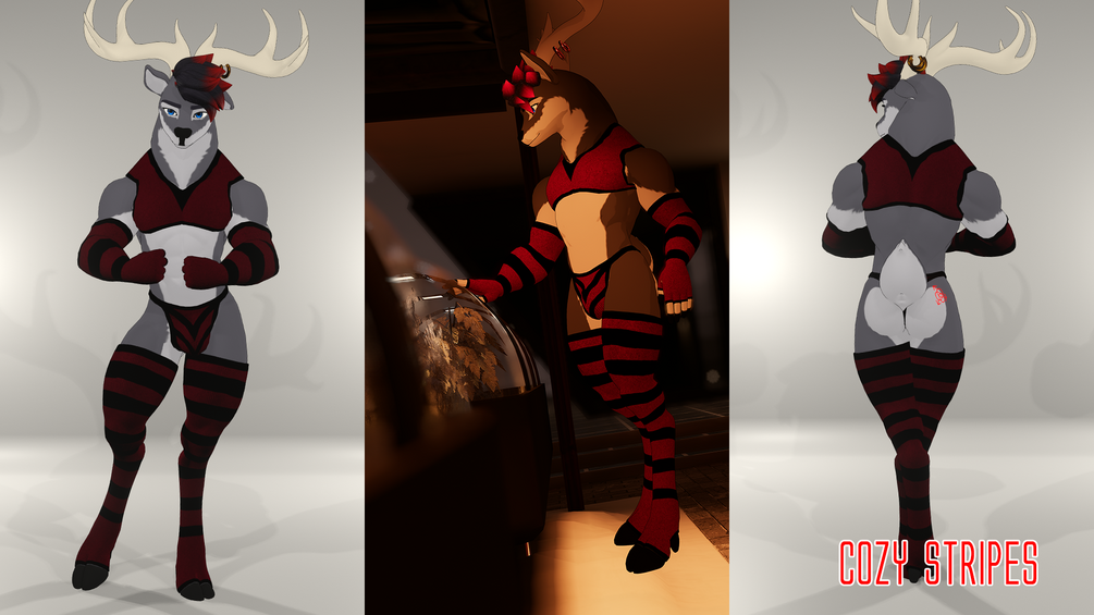 Default look of smooth latex with colorful switch, snugly knitted stripes, and center stage metallic fishnets which are color adjustable directly in unity before uploading. Additional HimboHooters outfit included just in case you find yourself on behind the bar.